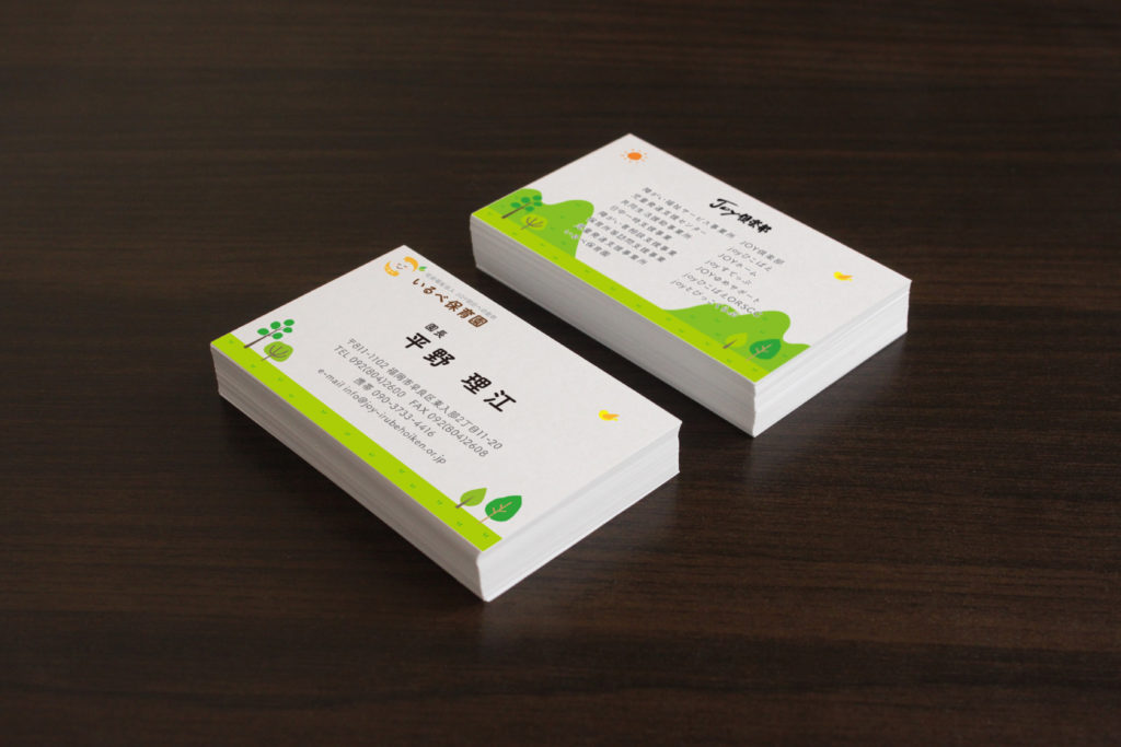 名刺作成の際は色やイラスト、記載内容など注意点や好まれるデザイン等ございますので、どんな内容にしたらいいか分からない、どんなデザインにしたらいいか分からないなどお困りのことがございましたらお気軽にほいくデザインにお問い合わせください。