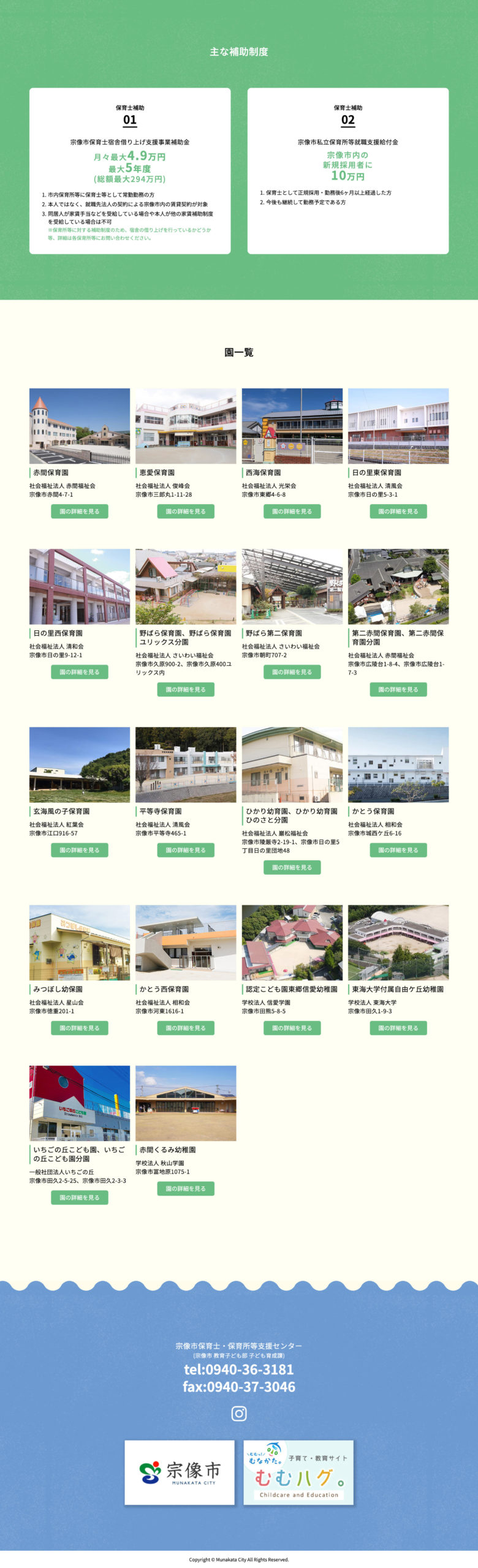 補助制度の紹介や宗像市の保育園を一覧で表示、気になる園の紹介動画や詳細を閲覧でき、宗像市で保育士を目指す際に必要な情報を凝縮したサイトに仕上げました。